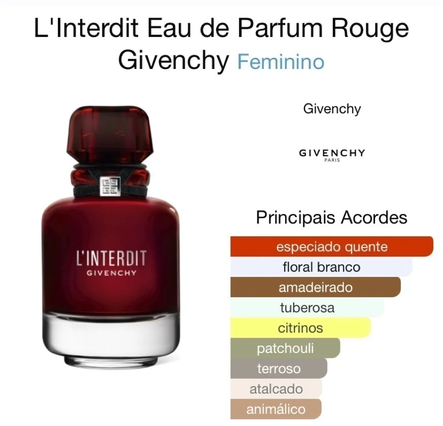 L’Interdit Rouge é intenso, provocante e absolutamente envolvente. Um perfume criado para mulheres ousadas, confiantes e apaixonadas, que gostam de fragrâncias marcantes e cheias de personalidade.